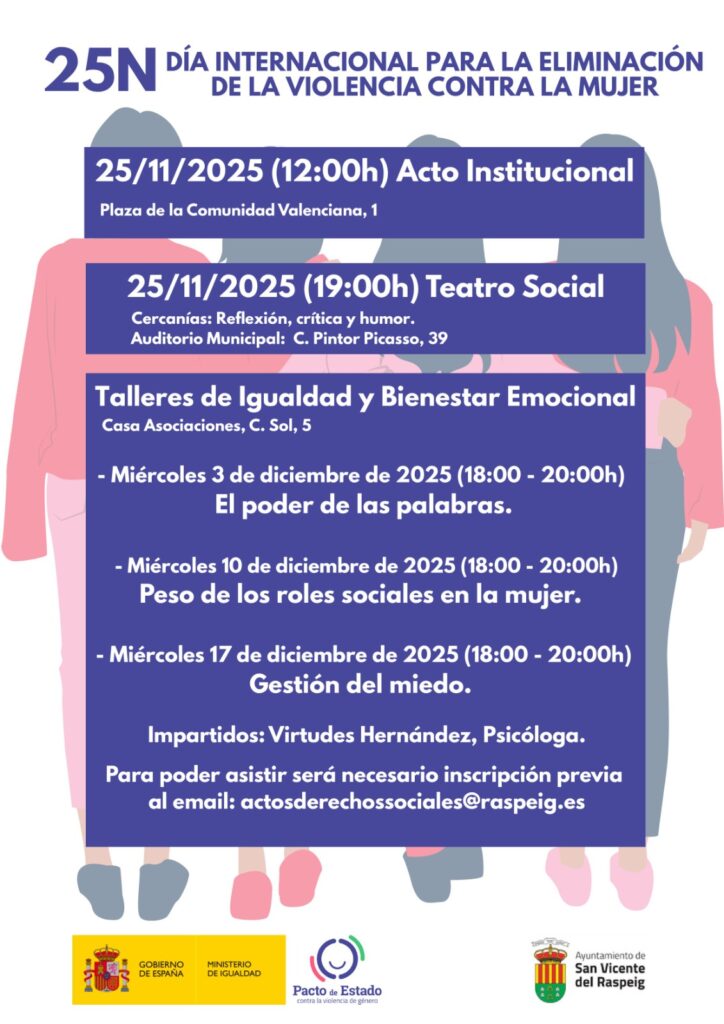 En la tarde del 25N, se representará en el Auditorio municipal la obra de teatro social ‘Cercanías’, una reflexión planteada desde la crítica y el humor. El programa se completará con tres talleres sobre bienestar emocional que impartirá la psicóloga Virtudes Hernández los miércoles 3, 10 y 17 de diciembre a las 18 horas en la Casa de Asociaciones, situada en la calle Sol. Para poder asistir será necesario inscribirse previamente en el email actosderechossociales@raspeig.es. El primer taller, el 3 de diciembre, se dedicará a analizar el poder de las palabras. Los otros dos encuentros, que tendrán lugar los días 10 y 17 de diciembre, se centrarán en la temática en torno al peso de los roles sociales en la mujer y la gestión del miedo, respectivamente.