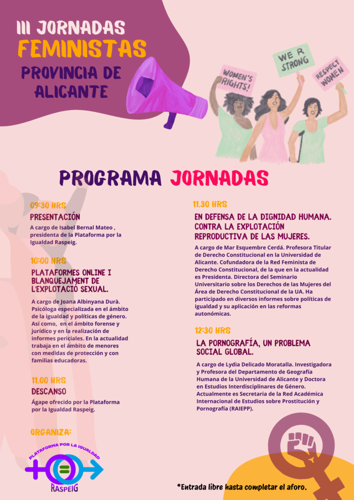 La asociación organizadora es un colectivo feminista del municipio comprometido con la defensa de la igualdad real entre mujeres y hombres, la sensibilización social y la lucha contra todas las formas de violencia y explotación hacia las mujeres. La PIR invita a la ciudadanía a participar en estas jornadas, que buscan generar pensamiento crítico, conciencia social y redes de apoyo feminista en la provincia de Alicante.
